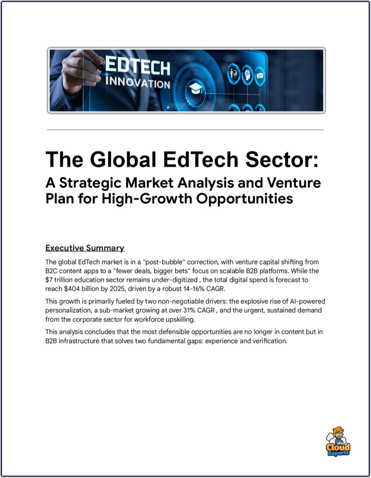 This plan describes the market opportunity for Education Technology (EdTech), identifying niche segments for entrepreneurs and partners to organize around and prosecute.